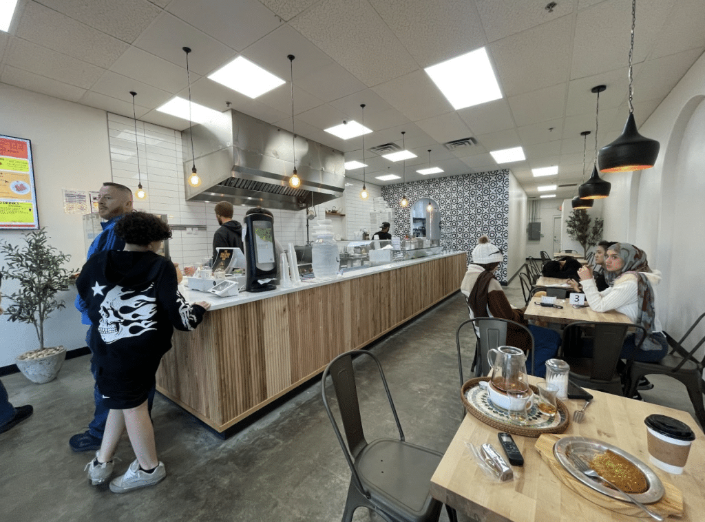 Now, one of them is Wowbooza, a brightly lit cafe that Salem opened over the summer in Duluth. Its primary focus is the object of Salem’s obsession—chewy, mastic-based ice cream—but he offers other sweets to go with it: crepes, baklawa, kunafa, and Dubai chocolate bars. Another beloved Middle Eastern dessert, kunafa combines a cheese filling with shredded filo dough (kataifi), and is doused with syrup before being served hot; Salem’s Dubai chocolate bars, filled with kataifi and pistachio paste, were inspired by a viral TikTok phenomenon.