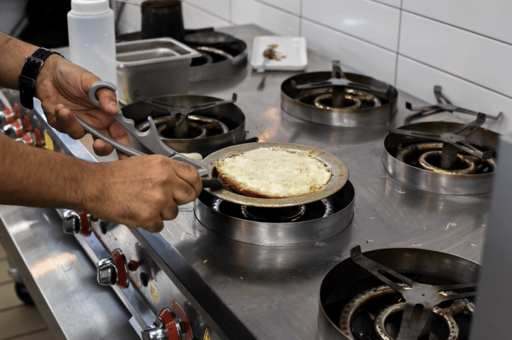 And a special stovetop, imported from Turkey, for kunafa—it rotates the pans over a flame. Salem makes a softer kunafa in the style of the West Bank city of Nablus, plus a crunchier Turkish kunafa. Preparing the latter version one recent afternoon, he carefully flipped the pastry so it’d brown evenly on both sides, then served it sizzling hot—the cheese inside of it gooey and rich, the long strands of kataifi like crisp noodles, a sprinkle of pistachios on top. The dessert is meant for two people and can be ordered a la mode.