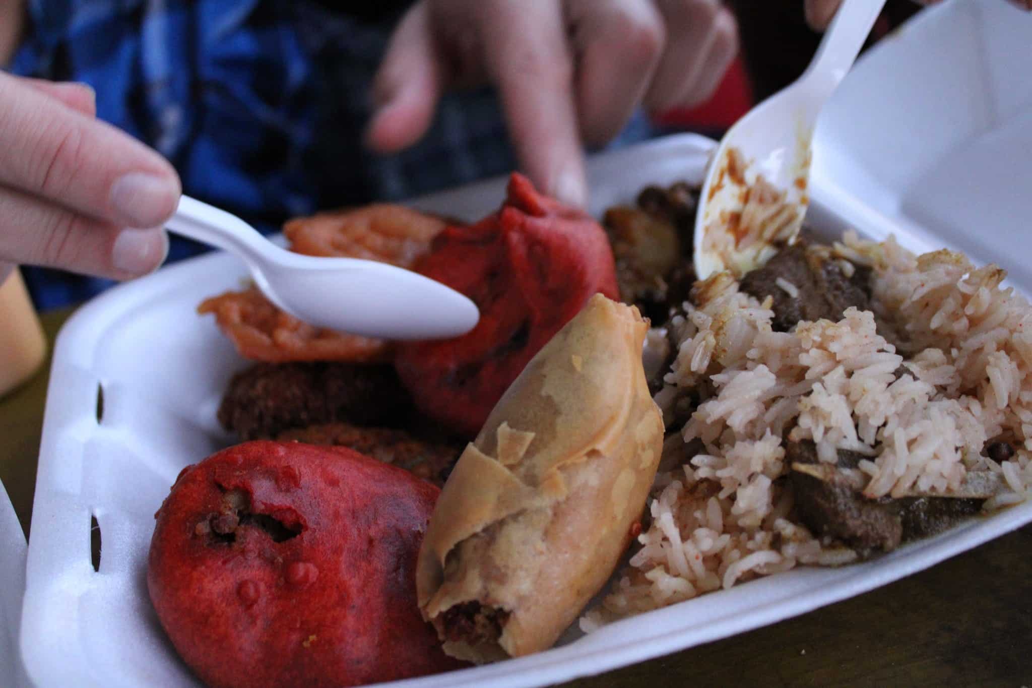 There we are – digging into the $10 iftar box which included pakoras, biryani, channa, a samosa, and some jalebis.