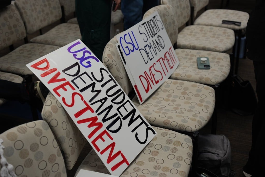 On Thursday, a group of about 30 students, alumni, and activists showed up at the University System of Georgia Board of Regents meeting to urge divestment from companies directly involved in the war in Gaza.
