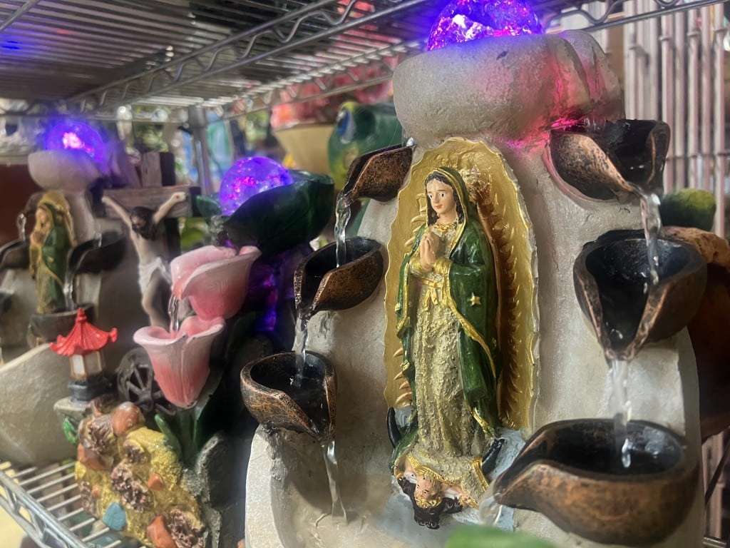 En otro rincón del centro comercial, Cristina y Eduardo, una pareja salvadoreña, son dueños de una pequeña tienda que vende rosarios, estatuas de Jesús y de la Virgen María, y figuras de madera—versiones de los tipos de recuerdos que se pueden encontrar en muchas tiendas de Plaza Fiesta. Han sido propietarios de distintos negocios en Plaza Fiesta durante unos 18 años, dijeron.