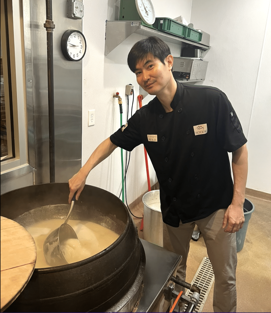 For two to three hours, the action is nonstop. On the busiest days, Kim says he starts with 33 pounds of soybeans that have been soaked in water overnight; to achieve the best flavor, he sources half his beans from Iowa and half from Danyang, South Korea. After the beans are pulverized, Kim boils the extracted liquid with water in a waist-high cauldron, diligently stirring for an hour until it thickens. “You can smell some savoriness,” he says—a sign it’s ready for the next step.