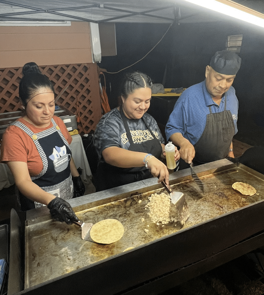 The two women at the grill were Maria and Jose’s youngest daughter, Miriam, and Miriam’s godmother Monica. “When we first started selling food, I was young, so I couldn’t help with much,” Miriam said. “But as I got older, my dad started teaching me how to work the grill.” Given how much she’s learned from her father, Miriam said, she feels like “the son he didn’t have.” Now she was fielding multiple orders at once, grilling meat for tacos while scanning the crowd. She sometimes notices customers she hasn’t seen in years, she said, dropping by to show their support. But it was no surprise to see people come out and support considering her dad is well known by the community around them and is “very grateful to everyone for their support”.