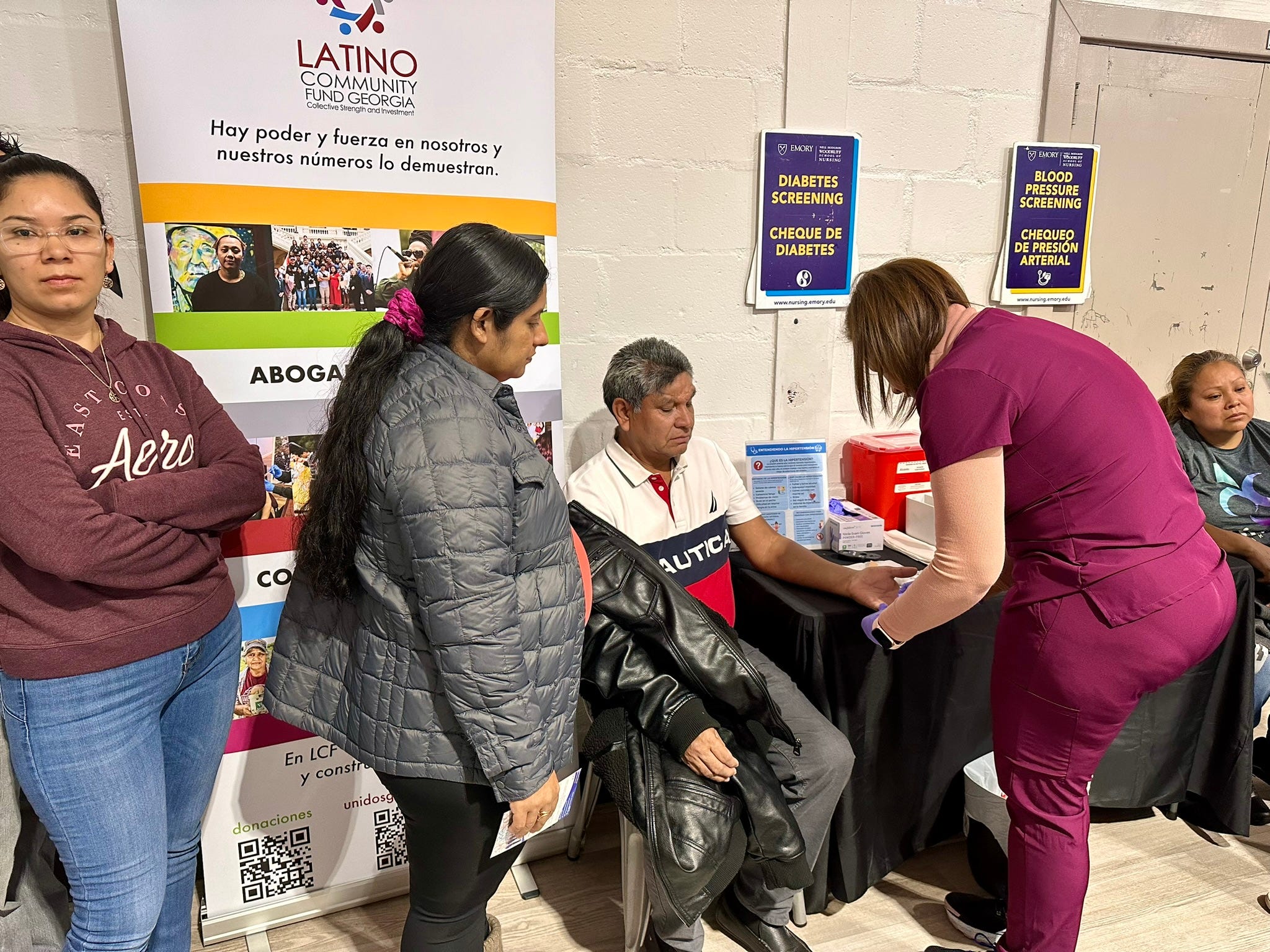 Dos personas de Emory hicieron chequeos de presión arterial y azúcar a adultos, voluntarios del Feminist Women’s Health Center proporcionaron ropa a las mujeres y el Latino Community Fund Georgia repartió información sobre la organización y los recursos disponibles.