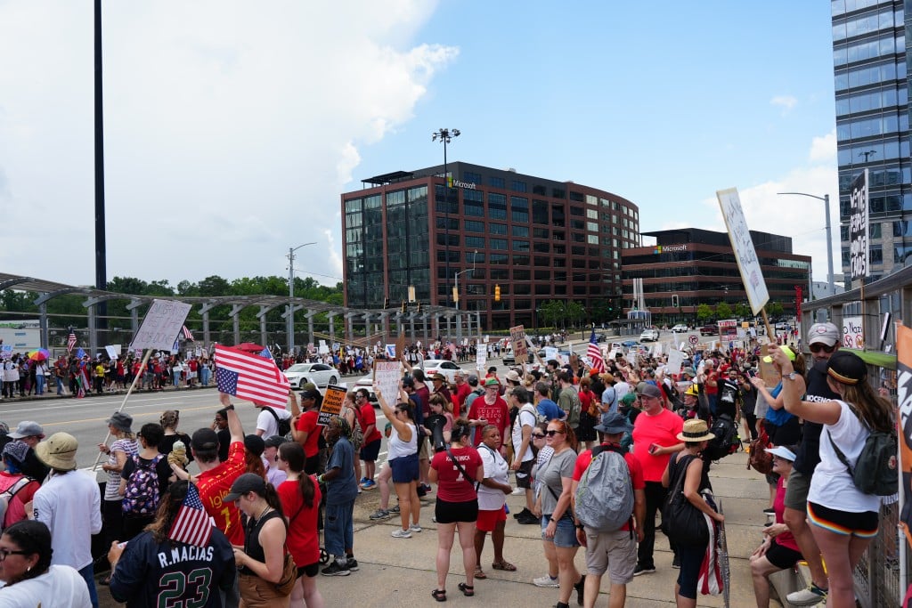 Just 11 miles away from Chamblee Tucker Road, where people gathered to demand an end to ICE deportations, only to be met with force, protestors in spots around Atlanta, including at Atlantic Station, also showed their support for immigrants, as well as spoke out about about Diversity Equity and Inclusion, due process, trans rights, and against fascism.