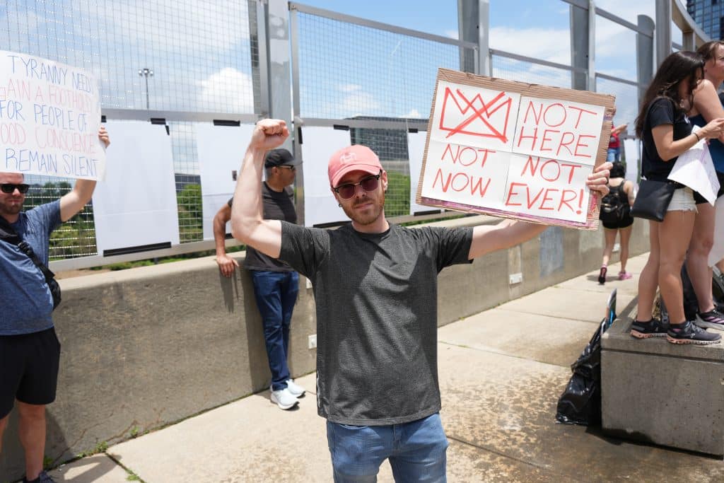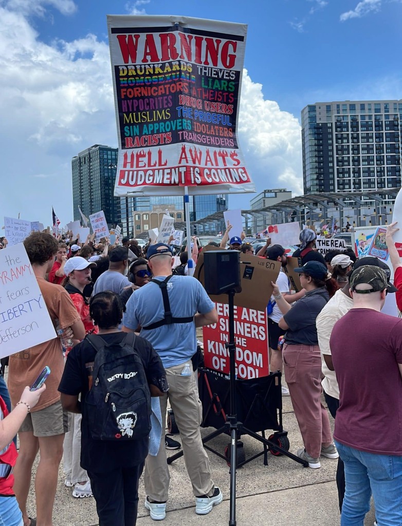 At the gathering, there was one counter protester opposing those who came to the overpass, and called some of them “sinners”. While he read some verses of the Bible through a microphone and a speaker, other protesters chanted louder. Others tried to engage in verbal disputes with the man, who ignored them or asked them to step back from him. There was no physical altercation between the protesters and the man.