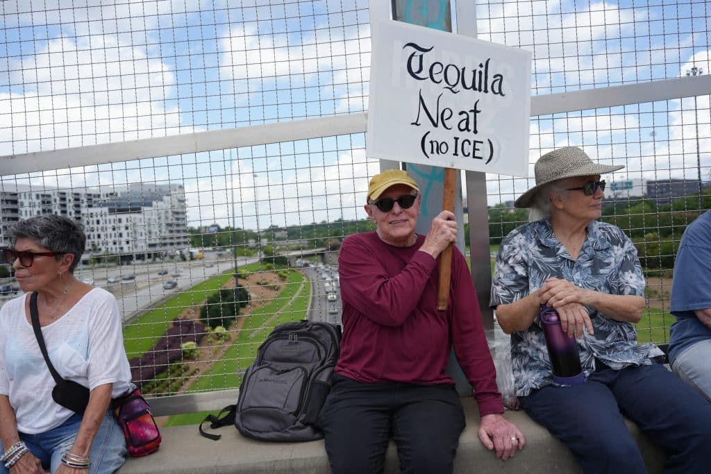 As the temperatures reached 84 degrees and people dripped with sweat, volunteers wearing fluorescent vests walked around the overpass to give away free water.