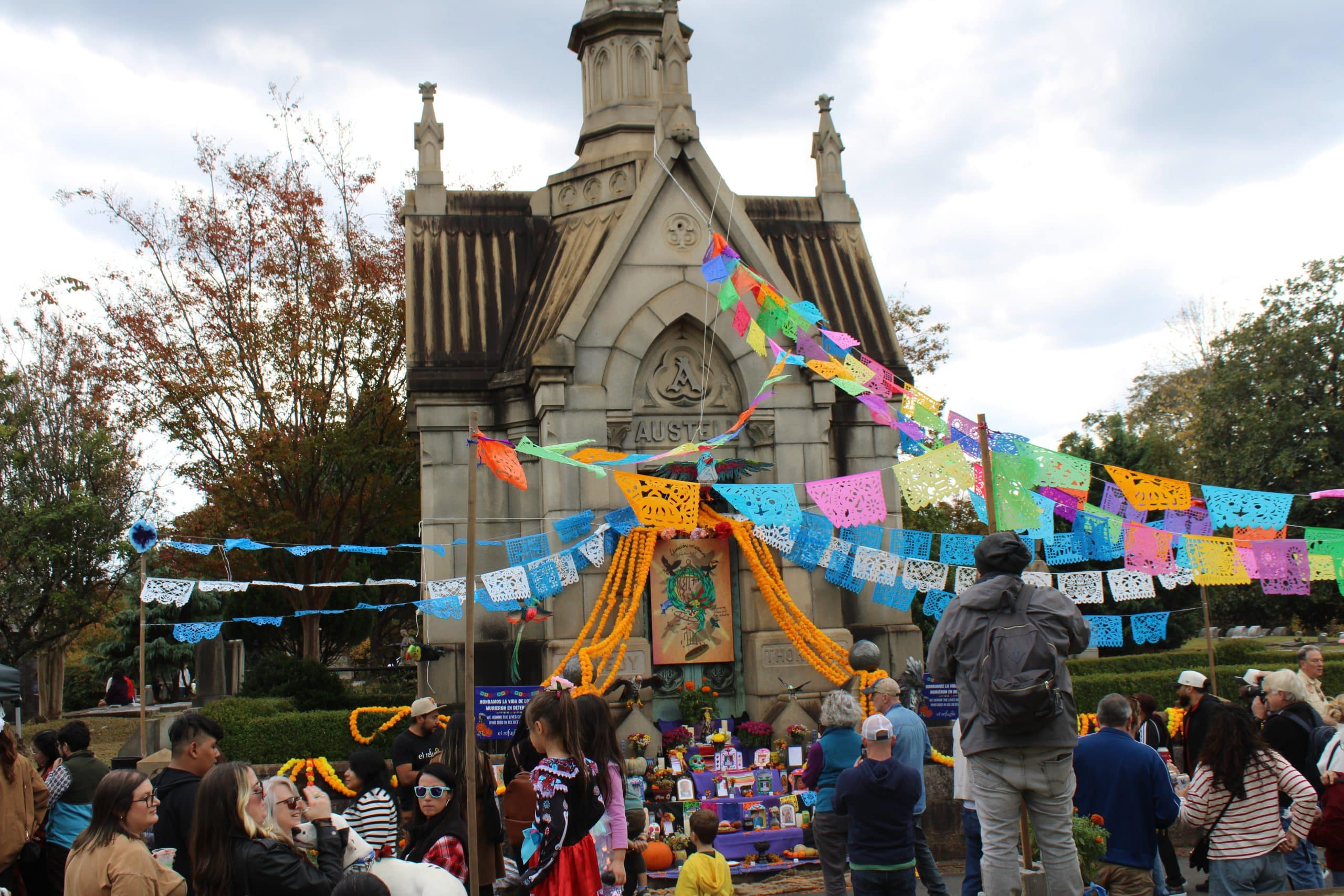 “This is the first time actually that I bring my guitar,” said Amilcar, who’s the executive director of El Refugio, a nonprofit that supports the loved ones of those being held at Stewart Detention Center in Lumpkin. He was one of hundreds who came out on an overcast Sunday for the cemetery’s annual Dia de los Muertos festival, sponsored by the Consulate General of Mexico and the Institute of Mexican Culture. Falling on November 2, the Day of the Dead is a Mexican observance, rooted in Indigenous and Catholic tradition, to honor the deceased—often with ofrendas, or altars, built in their memory.