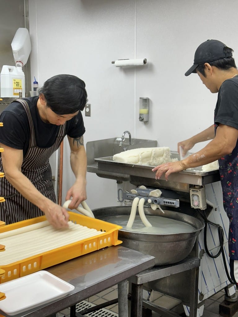 Making garaetteok, the longer cylindrical rice cakes that are sliced into tteokguktteok, is no easy feat. The cooks at Nak Won begin each night at 11 p.m. by steaming the rice, creating a dough that’s extruded through a tube—similar to sausage making—into a bath of warm water, which helps prevent sticking. The workers take the long strips out of the water and cut them into a more manageable size; they’re then set aside for preorders, packaged into smaller styrofoam packets, or placed in an industrial fridge, where they’ll chill for two days before being sliced into smaller tteokguktteok.
