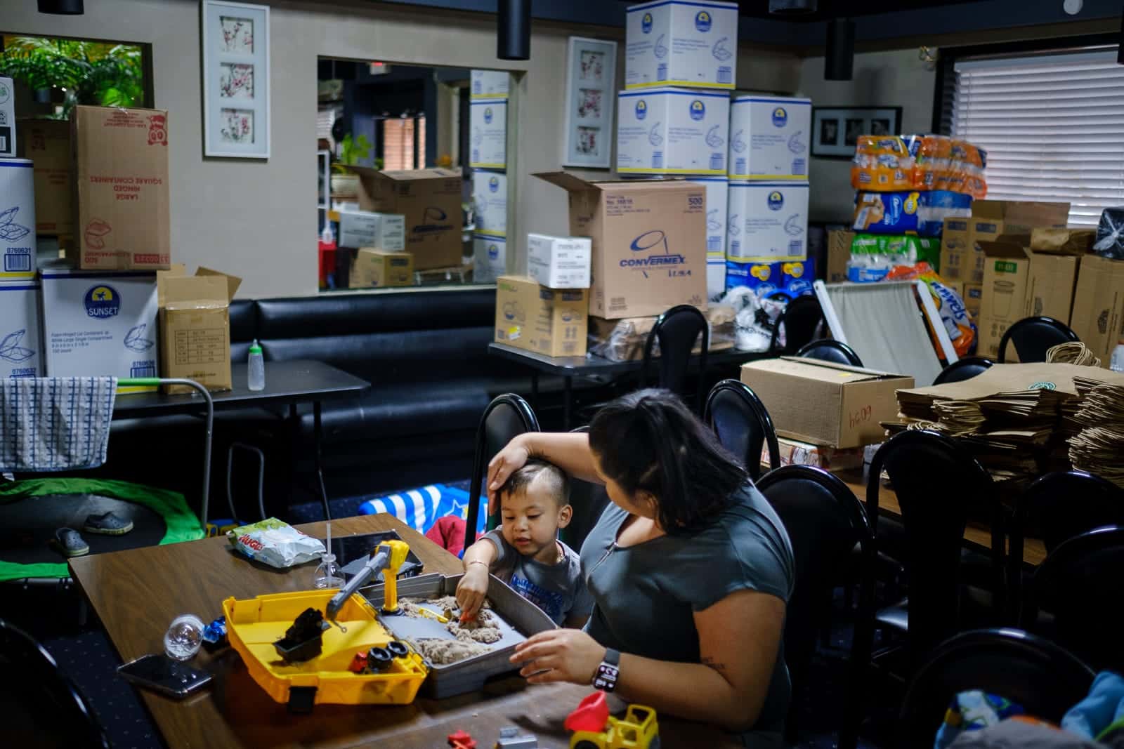 She’s now back working at a law firm as a paralegal, but between the recent Omicron surge and daycare staffing shortages, Jintana decided to keep her son with her brother at the restaurant. A table with Akana’s toy trucks and a small sandbox are sandwiched between tables piled high with boxes of takeout containers.